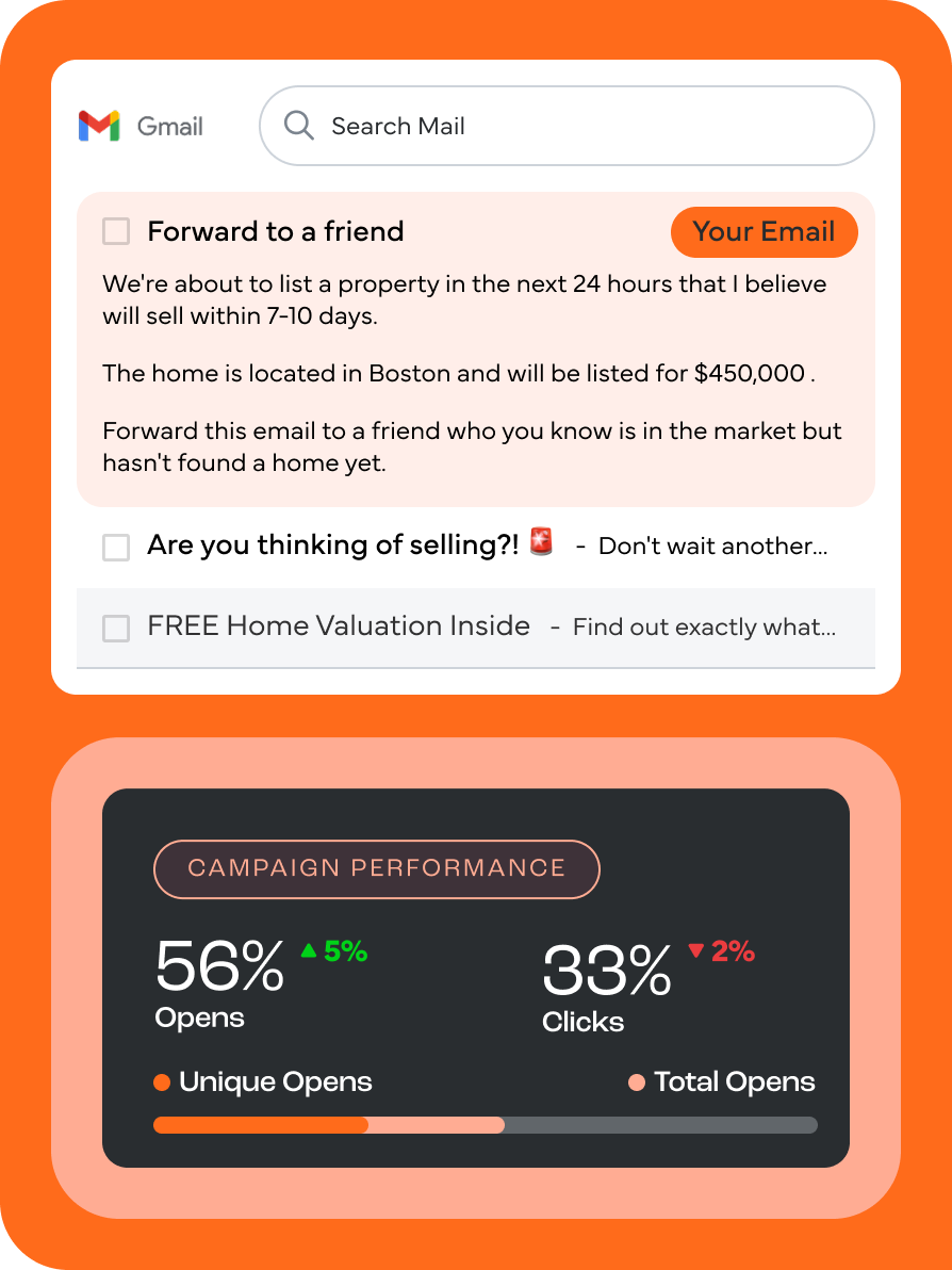 Promote your listings, share market updates, and deliver valuable content—all within seconds. Keep track of open rates, latest communications with potential clients, and more. Our CRM integrations with Lofty and Follow Up Boss make your email campaigns a breeze, from first contact to signing a contract.